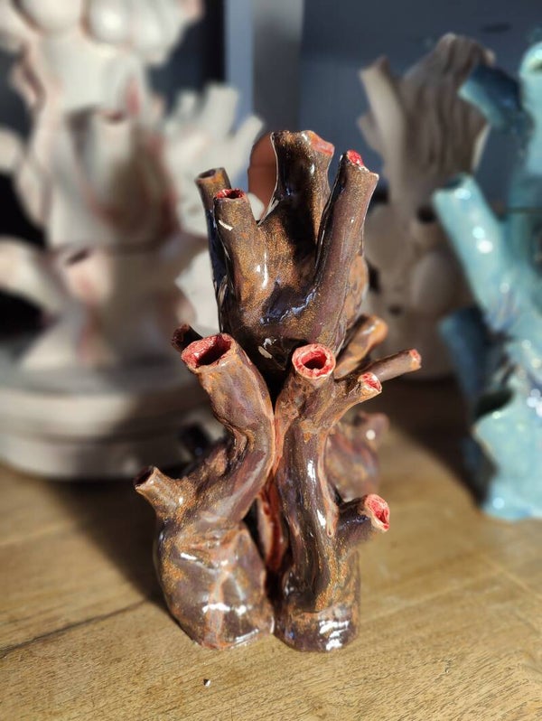 Handgevormd, Kopereffect glazuur (buiten), transparant glazuur met rood pigment (binnen) aardewerk