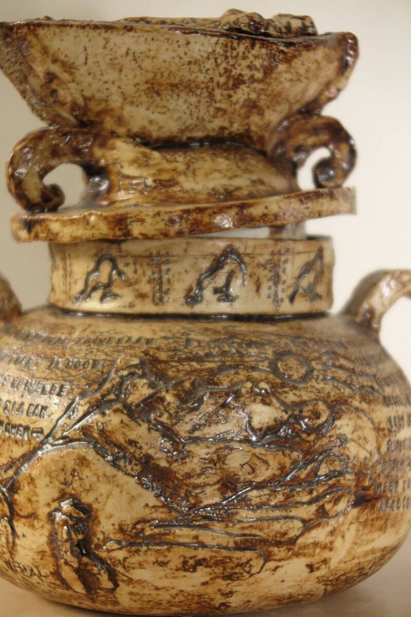 Kleiplaten in drukvormen, geboetseerd reliëf en deksel, gedicht in drukletters, ingewreven mangaanoxyde, mattransparant glazuur, aardewerk
