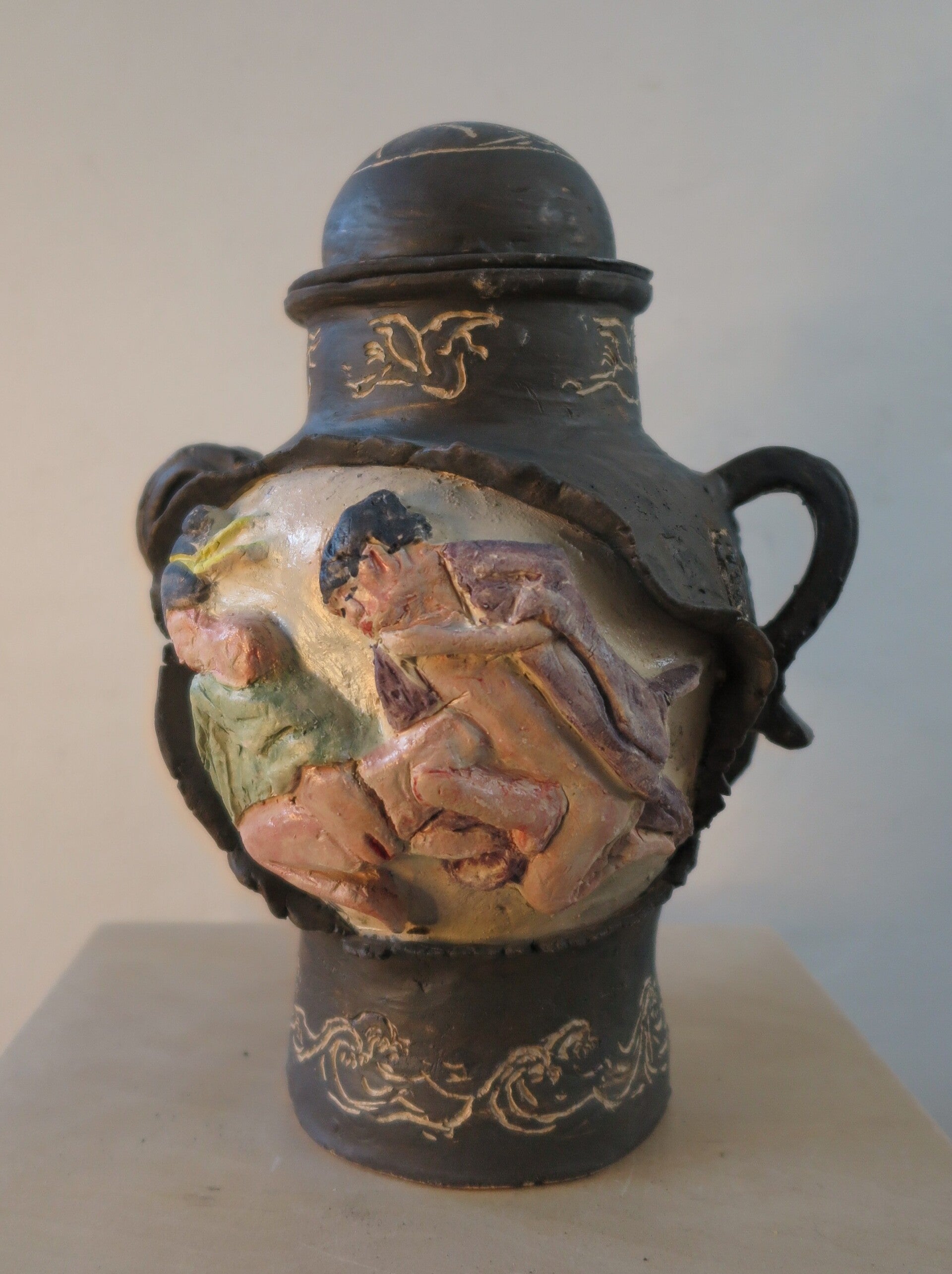Kleiplaten in drukvorm, opgeboetseerd, reliëf uit stempel, sgrafitto, mangaanoxide en engobe, kleurpigmenten en transparantglazuur